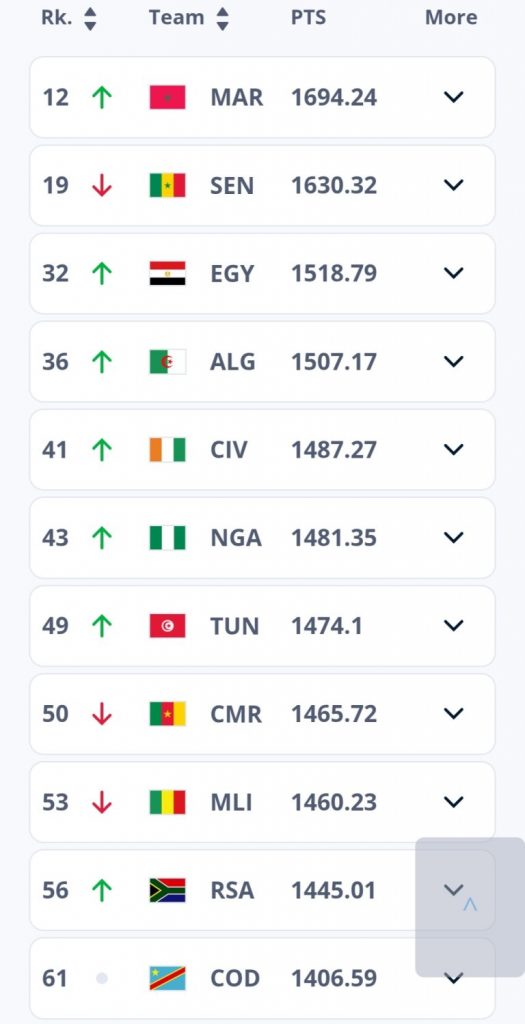 وفي السياق ذاته، صعد المنتخب التونسي بـ3 مركزا، حيث أصبح في الرتبة 49، بما مجموعه 1474.10، ومنتخب مصر بمركز ليصبح في الرتبة 32، بينما تراجع الكاميرون والسنغال برتبة واحدة، مقابل صعود نيجيريا وجنوب إفريقيا والجزائر بصف، وكوت ديفوار بخمسة مراكز كاملة.
