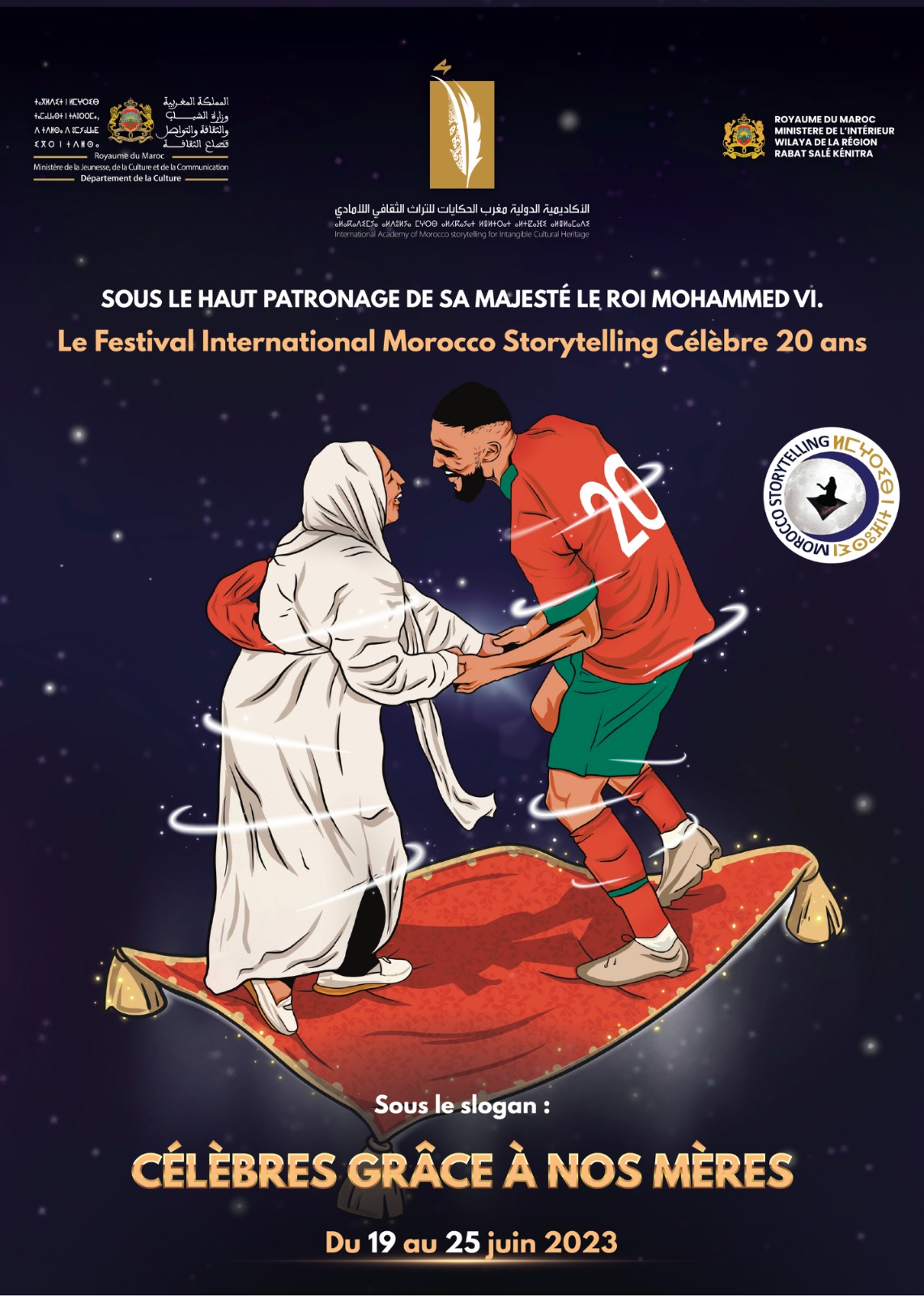 تحت الرعاية السامية لصاحب الجلالة الملك محمد السادس نصره الله وأيده . تعلن الأكاديمية الدولية مغرب الحكايات للتراث الثقافي اللامادي( جمعية مغرب الحكايات للثقافة والتراث اللامادي سابقا ) ، أنها ستنظم الدورة ال20 للمهرجان الدولي ” مغرب الحكايات ” بشراكة مع وزارة الشباب والثقافة والتواصل -قطاع الثقافة- وولاية جهة الرباط سلا القنيطرة ، تحت شعار :” عظماء بأمهاتنا”، وذلك في الفترة الممتدة ما بين 19و 25 يونيو 2023 ، بمختلف فضاءات مدينة الرباط. على أن يحتضن فضاء شالة الأثري حفل افتتاح فعاليات المهرجان. فيما ستتوزع باقي فقرات هذا الأخير على فضاءات عاصمة الأنوار.