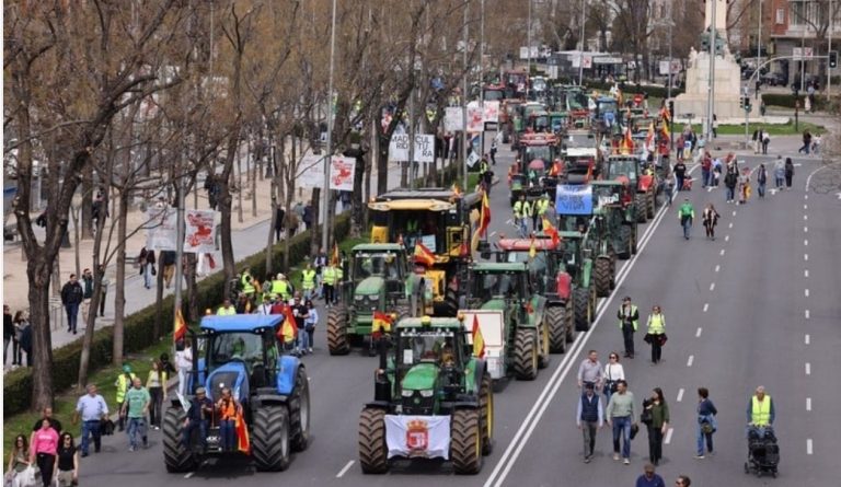 تظاهر مئات المزارعين في العاصمة الإسبانية، أمس الأحد، سيرا وبالجرارات، في إطار سلسلة الاحتجاجات على الأزمة التي يواجهها القطاع الزراعي.