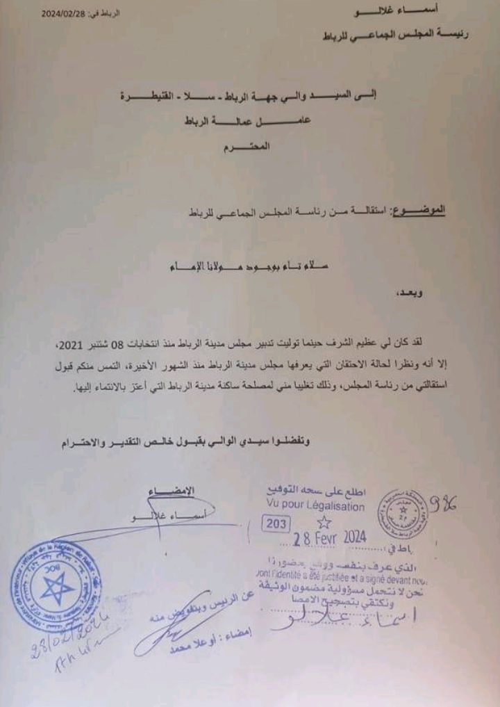 هذه هي قراءتي لإستقالة السيدة أسماء اغلالو عمدة مدينة الرباط ،تتبعت مسيرتها منذ توليها المنصب 8شتنبر 2021 إلى يوم 28فبراير 2024 حيت توصلت بوثيقة استقالتها مرفوعة إلى السيد الوالي المحترم محمد اليعقوبي (بعد التأكد منها) ،